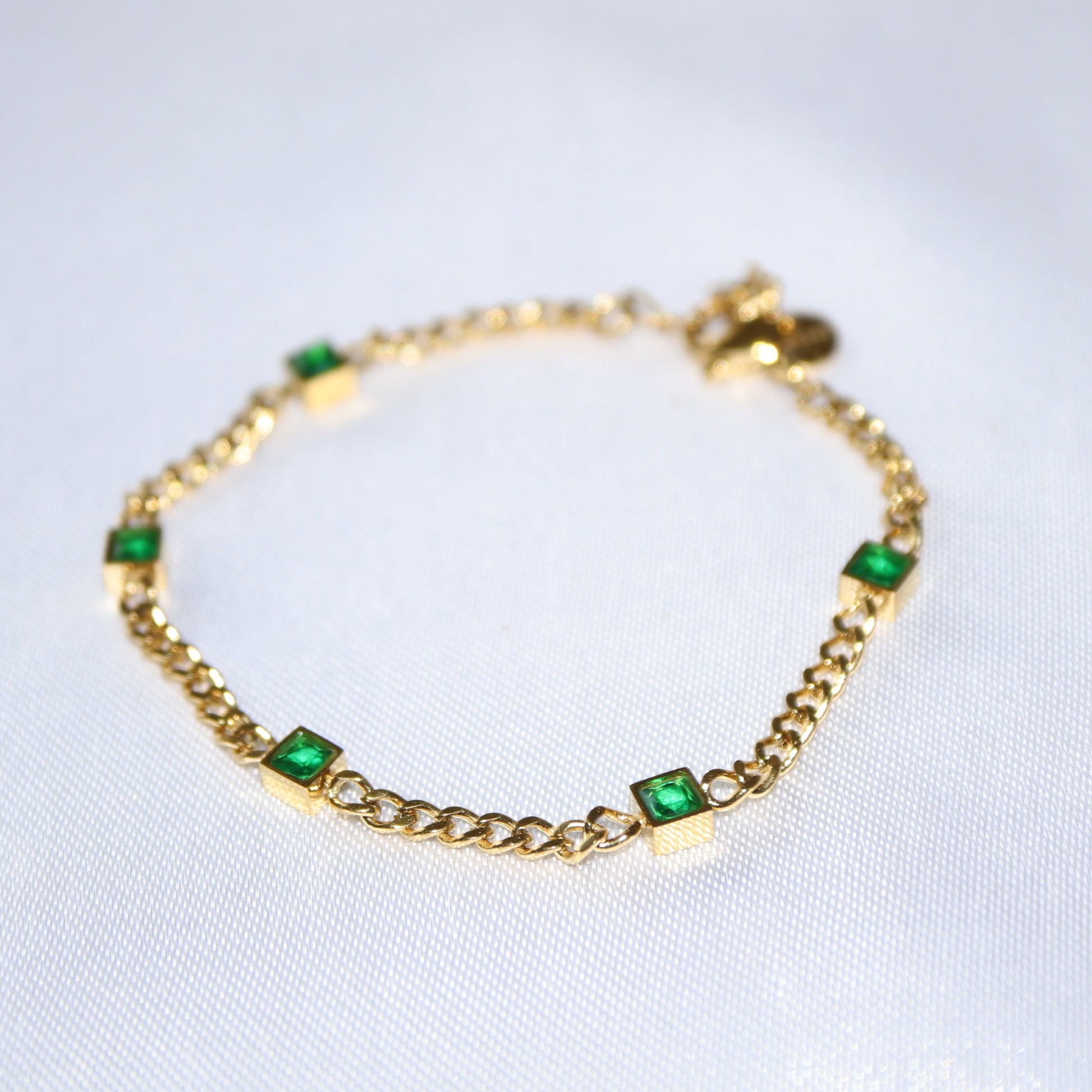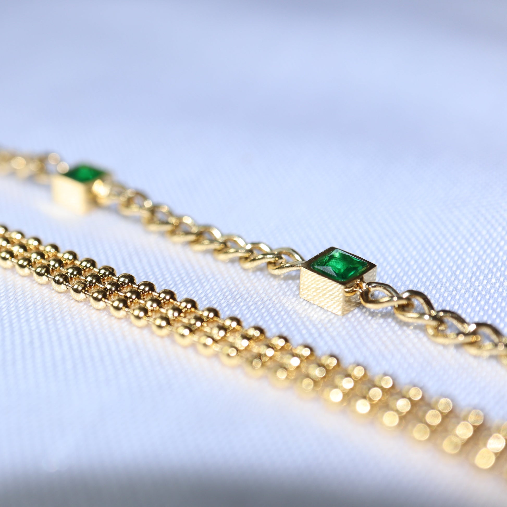 The Layla Stack is a duo of distinct bracelets designed to complement each other beautifully. One features a sleek multi-strand gold chain, while the other adds contrast with bold emerald-toned stones set along a classic link chain.