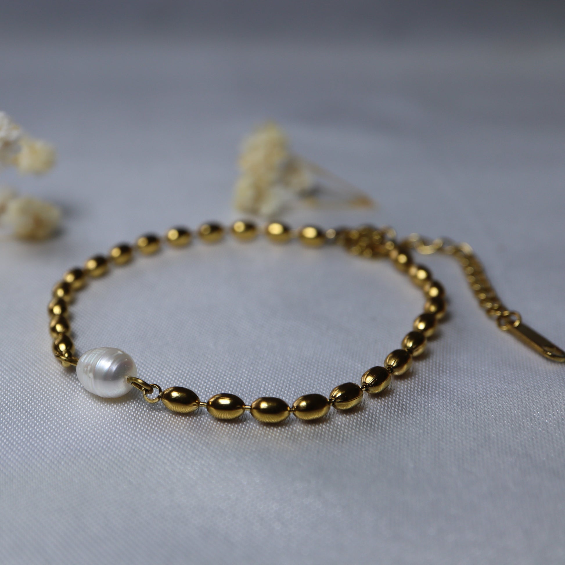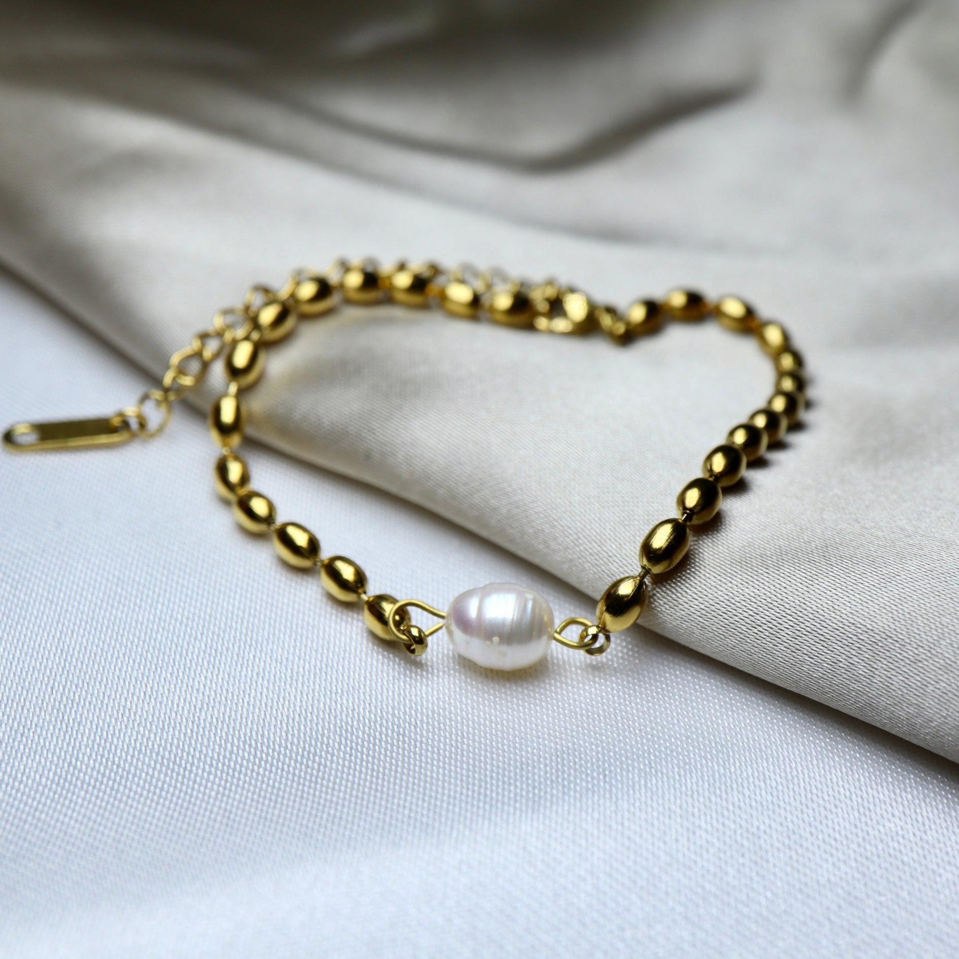 The Silken Grace Bracelet is a tribute to quiet sophistication. Designed with high-shine gold-toned beads and accented with a single luminous faux pearl at the center, this bracelet evokes the smooth flow of silk and the grace of a gentle presence.